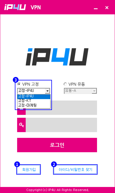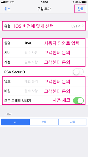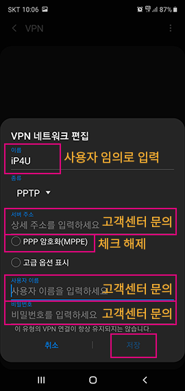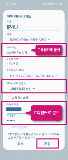 선택, 서버 주소/사용자 이름/비밀번호 입력
