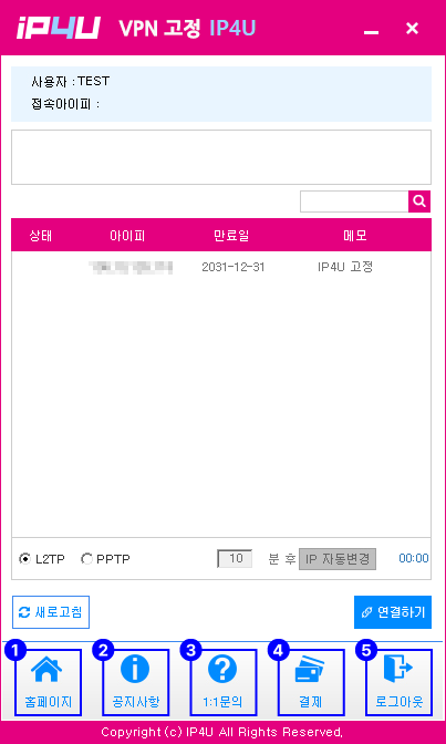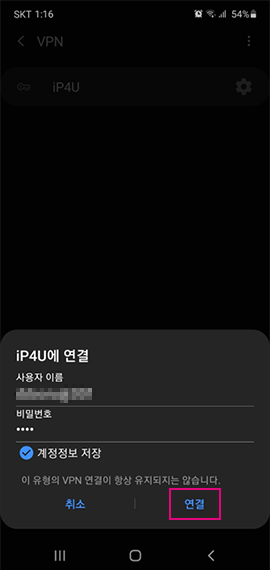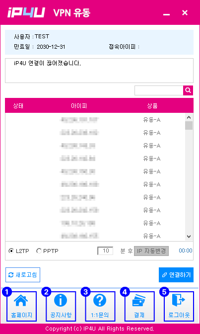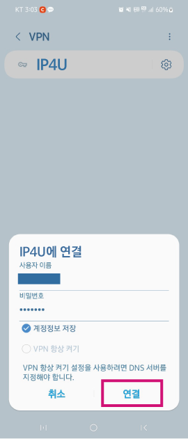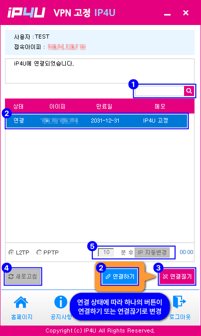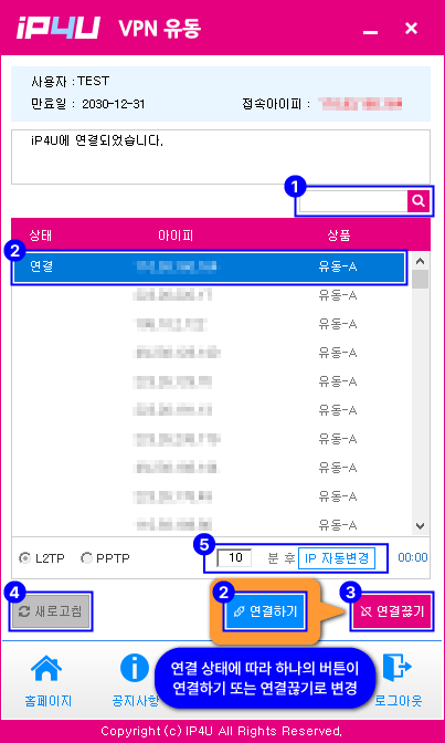 버튼을 눌러주면 VPN이 연결됩니다. (아이피 선택한 후 바로 더블클릭해도 연결 가능)