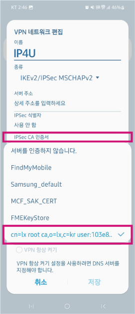 14. IPSec 서버 인증서 [서버로부터 수신]